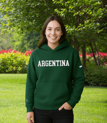 Buzo hoodie de friza. Letras en el frente aplicadas y bordadas. Bandera argentina bordada en la manga izquierda.